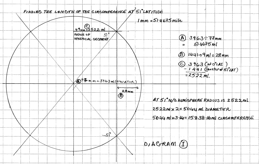 The tangents give the distance, keeping in mind the circumference of Earth at 51° N or – 51° N latitudes would be smaller than the equatorial circumference. (See diagram 1)