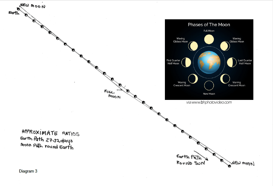 The phases of the moon are cited as proof . Yet the Earth is not stationary. Earth would have made roughly 1- twelfth of its journey around the sun when the moon completed one cycle around Earth. New moon to new moon or full moon to full moon, to simplify the picture. In this time Earth has moved 27.32 days (sidereal-time of lunar cycle). If this length in space is seen as a tube then it can be seen our moon spirals around the Earths path, not the Earth itself. Seen from a point outside the Earth-moon system, the fact that in each cycle it is both over the northern hemisphere and then the southern hemisphere could only occur if it spiralled round the Earth path. (See diagram 3)